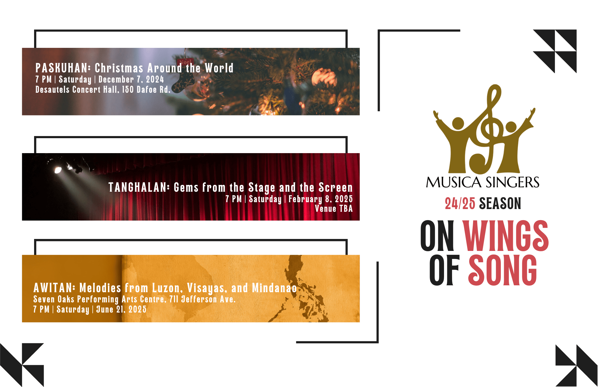 The Musica Singers’ second season, On Wings of Song, invites audiences on an inspiring journey through music that uplifts, unites, and celebrates cultural diversity. Featuring three distinct concerts—PaskuhanTanghalan, and Awitan—the season offers a rich blend of traditions, genres, and stories. Each performance showcases the ensemble’s versatility, artistry, and dedication to honoring heritage while embracing global perspectives. Through song, the Musica Singers continue their mission of bringing people together, capturing the beauty of shared experience, and elevating voices across communities and generations.